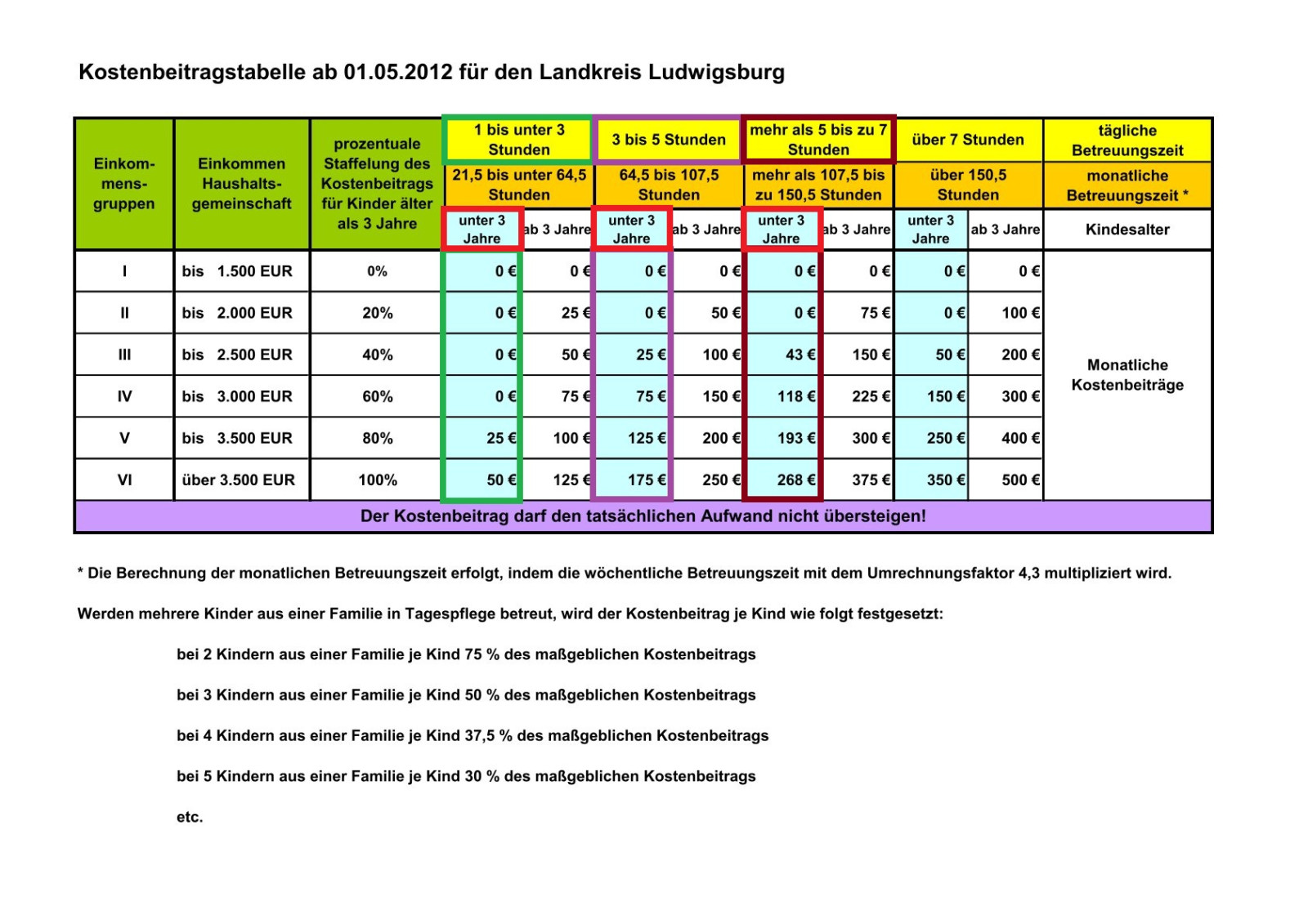 Kostenbeitragstabelle des Landkreises Ludwigsburg (siehe Bild oben).